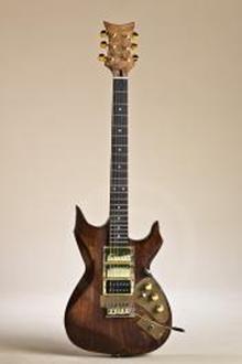 Customized Stratocaster, Modifications: Carved Body, New Neck, Striped paint for Wood Finish, Cut brass plate for electronics cover and pick guard, tin foil backing for grounding, installed electronics and new saddle. |